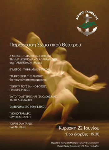 Jun 22 Παράσταση Σωματικού Θεάτρου στη Γλυφάδα 19:30 - 21:30 Κινηματοθέατρο Μελίνα Μερκούρη Γλυφάδα Ανατολικής Ρωμυλίας 123, Γλυφάδα Event Details Get Directions