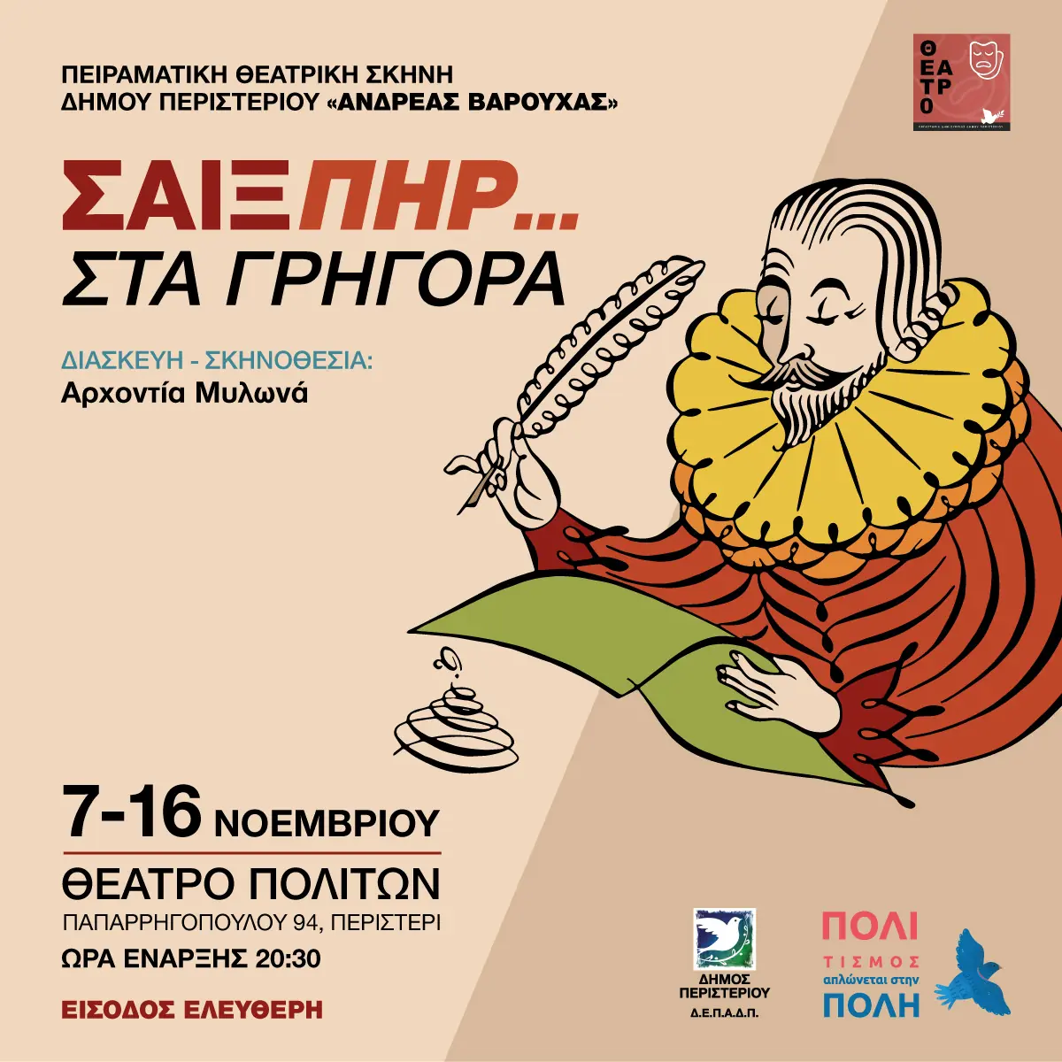 Nov 15 20:30 - 22:30 Σαίξπηρ στα γρήγορα στο Περιστέρι Θέατρο Πολιτών Δήμου Περιστερίου Δαμάστας & Παπαρηγοπούλου, Περιστέρι Event Details Get Directions
