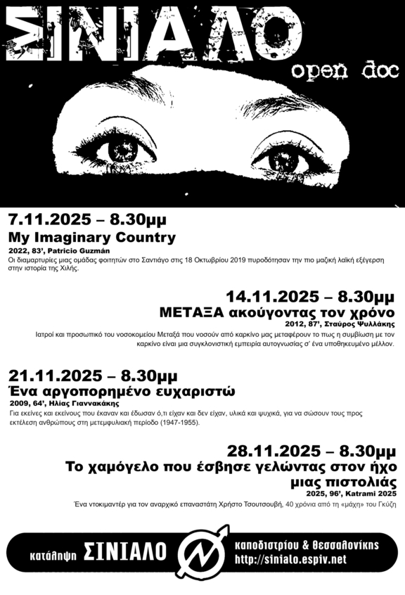 Nov 14 20:30 - 22:30 Προβολή Μεταξά ακούγοντας τον χρόνο Κατάληψη Σινιάλο Αιγάλεω Καποδιστρίου & Θεσσαλονίκης, Αιγάλεω Event Details Get Directions