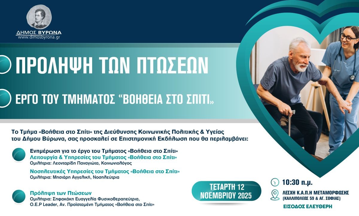 Nov 12 10:30 - 12:30 Επιστημονική Εκδήλωση για την Πρόληψη των Πτώσεων Α ΚΑΠΗ Μεταμόρφωσης Κ. Βάρναλη 34, Μεταμόρφωση Event Details Get Directions