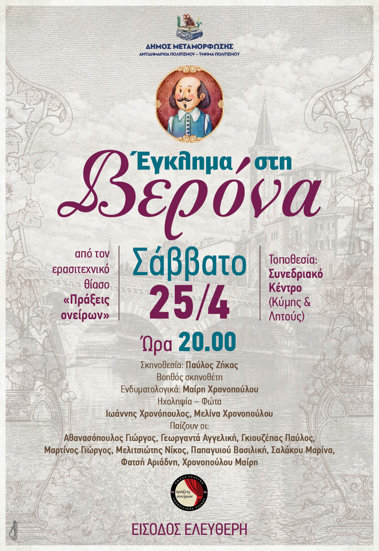Apr 25 Έγκλημα στη Βερόνα στην Μεταμόρφωση 20:00 - 22:00 Συνεδριακό Κέντρο Μεταμόρφωσης Αττικής Απόλλωνος & Λητούς, Μεταμόρφωση Event Details Get Directions