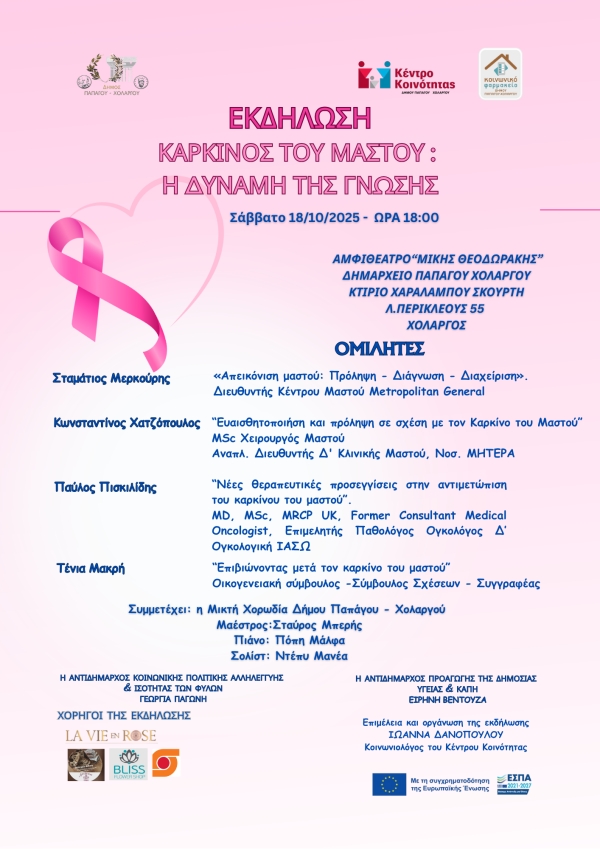 Oct 18 Eκδήλωση ευαισθητοποίησης για τον καρκίνο του μαστού στον Χολαργό 18:00 - 20:00 Δημαρχείο Παπάγου Χολαργού Περικλέους 55, Χολαργός Event Details Get Directions