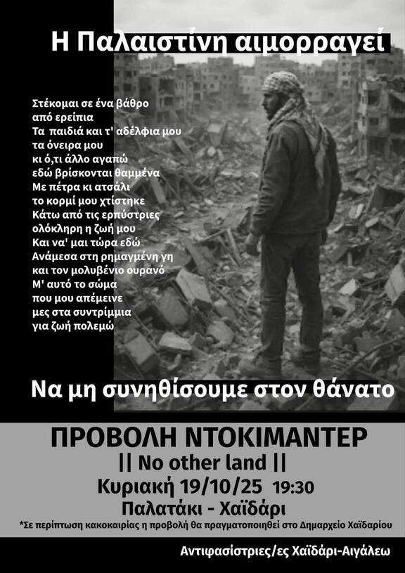 Oct 19 Προβολή No Other Land 19:30 - 21:30 Παλατάκι Χαϊδαρίου Λεωφ. Αθηνών 161, Χαϊδάρι 124 61, Λεωφ. Αθηνών 161, Χαϊδάρι 124 61 Event Details Get Directions
