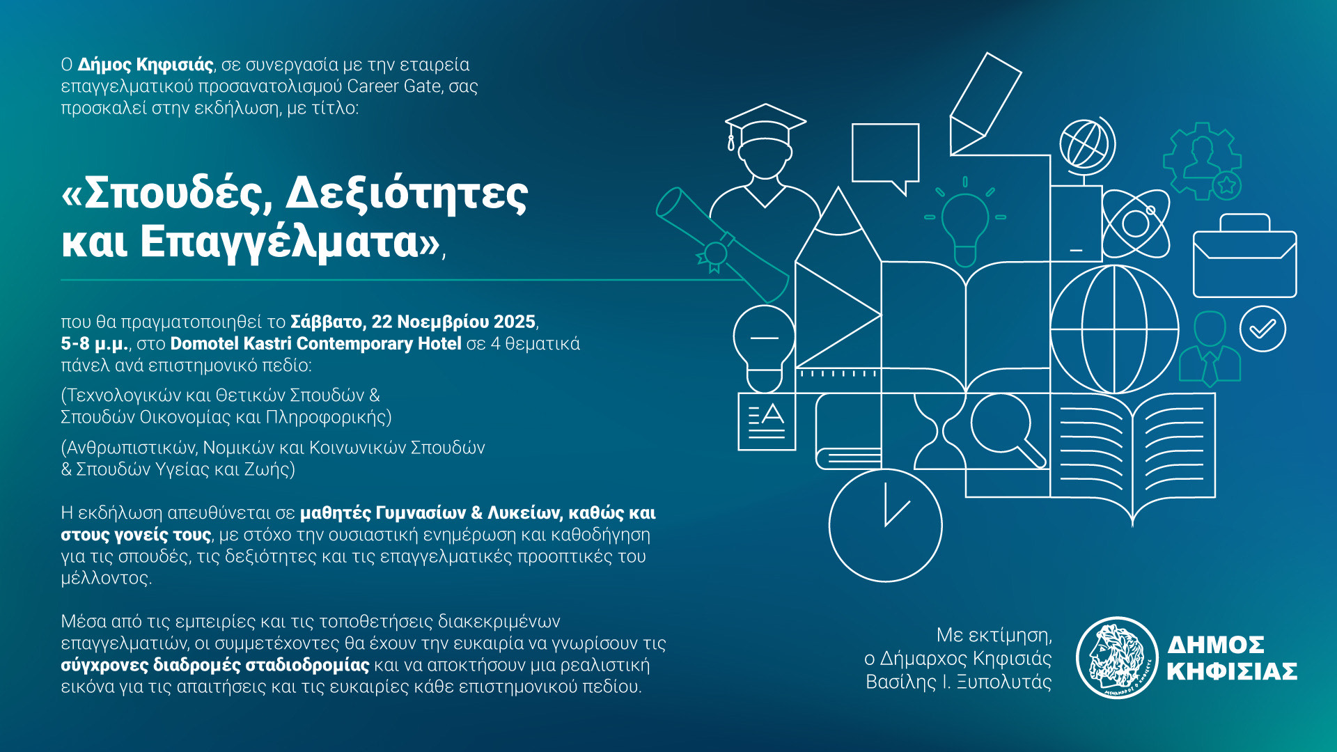 Nov 22 Σπουδές, Δεξιότητες και Επαγγέλματα στην Κηφισιά 17:00 - 20:00 Domotel Kastri Ελευθερίου Βενιζέλου 154, Καστρί Event Details Get Directions